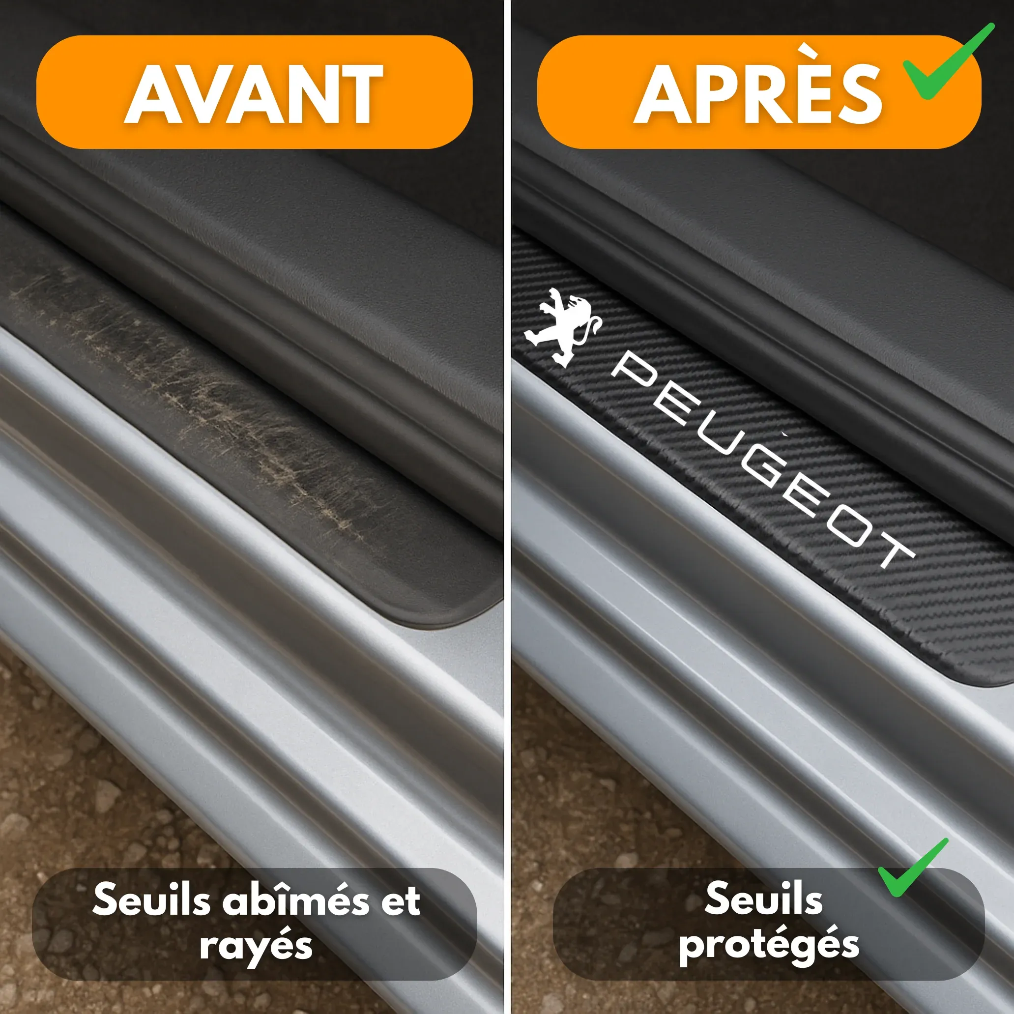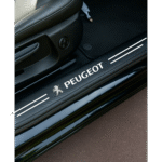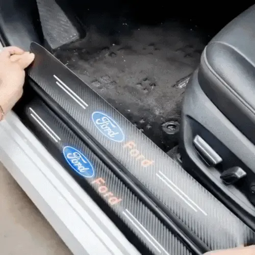 Design en carbone élégant avec logo, offrant un look luxueux et sportif, améliorant visuellement l’aspect général de la porte.